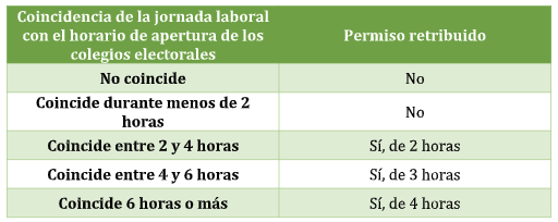 Sí, siempre que coincida la jornada laboral con el horario de apertura de los colegios electorales. La duración del permiso retribuido dependerá del grado de coincidencia de ambas obligaciones, de acuerdo con el siguiente cuadro: